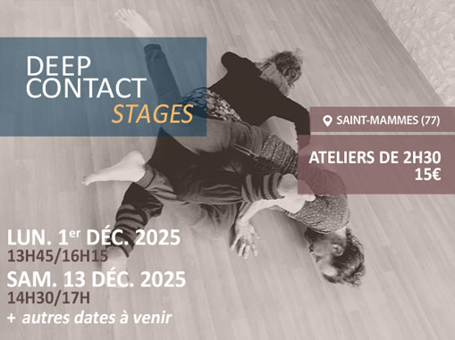 Le Deep Contact a été conçu par Carey JEFFREY quand son parcours dans le Butoh et le Body Weather a rencontré sa pratique du Contact Improvisation.