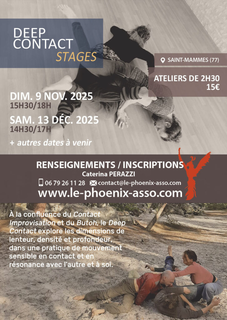 Tout au long d’une séance Deep Contact rythmée par plusieurs temps – échauffement, éléments de technique, recherche sensible, expression libre/Jam – les propositions de Caterina PERAZZI vous invitent à explorer dans la lenteur de multiples états de corps et de conscience – en individuel, en binôme ou en collectif, jusqu’à vous lover au cœur de la source du mouvement authentique, d’où jaillit et se déploie librement la danse.